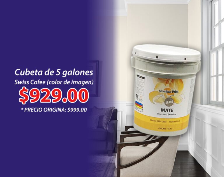 SWISS COFFEE (café suizo) Un color que combina con cualquier decoración. Cubeta de 5 galones, 100 % acrílica en acabado Mate. De $999 a $929 Oferta